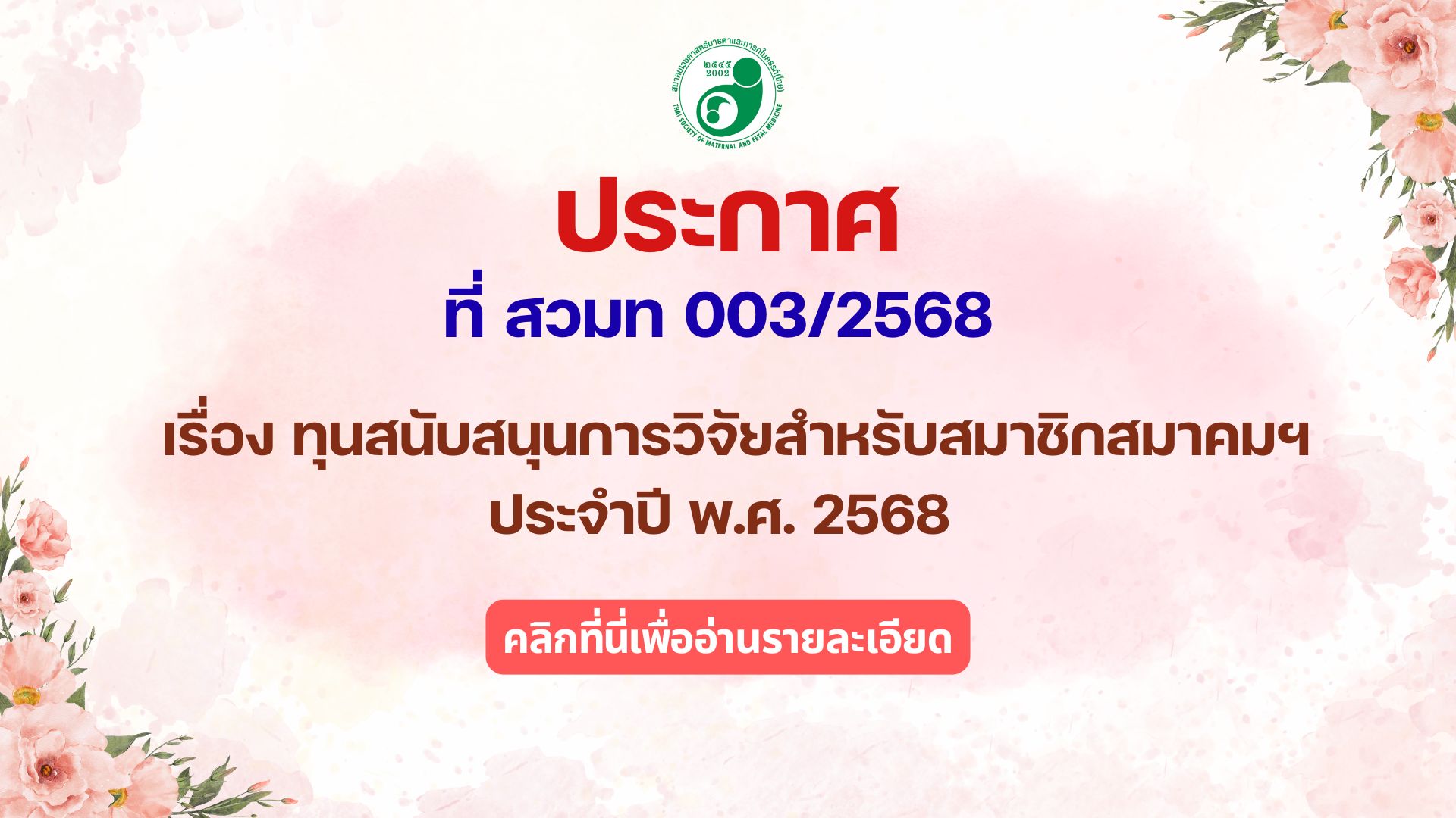 ประกาศ ที่ สวมท 003/2568 เรื่อง ทุนสนับสนุนการวิจัยสำหรับสมาชิกสมาคมฯ ประจำปี พ.ศ. 2568