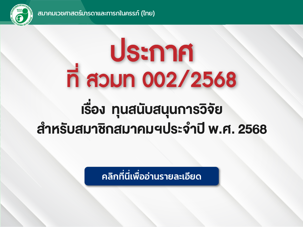 ประกาศ ที่ สวมท 002/2568 เรื่อง ทุนสนับสนุนการวิจัย สำหรับสมาชิกสมาคมฯประจำปี พ.ศ. 2568