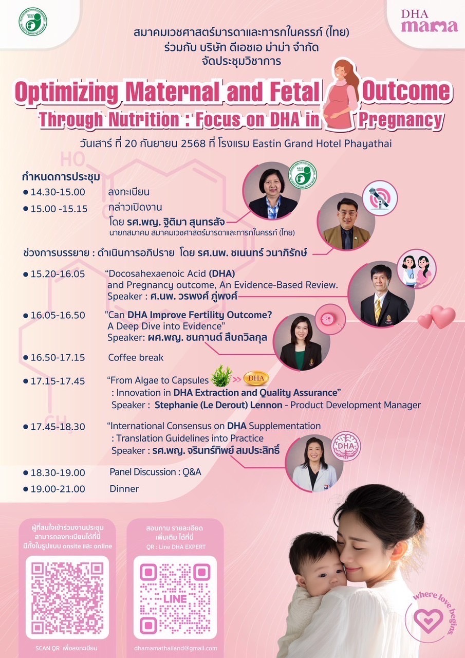 ขอเชิญลงทะเบียนเข้าร่วมงานประชุมวิชาการ เรื่อง Optimizing Maternal and Fetal Outcome Through Nutrition : Focus on DHA in Pregnancy ในวันเสาร์ ที่ 20 กันยายน 2568 ที่ โรงแรม Eastin Grand Hotel Phayathai -