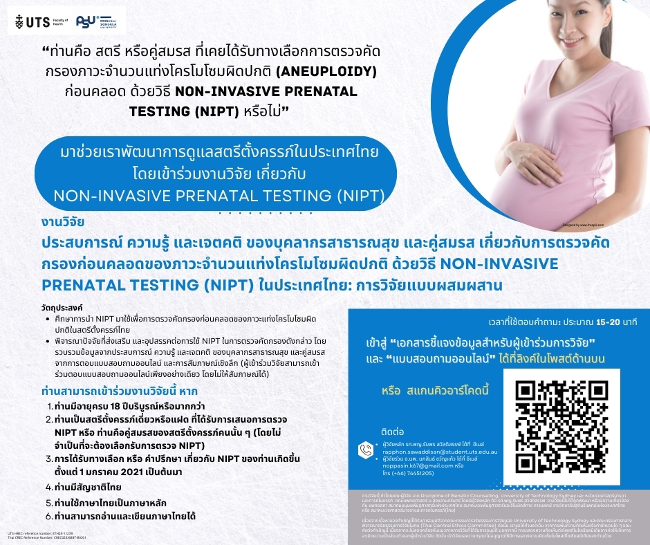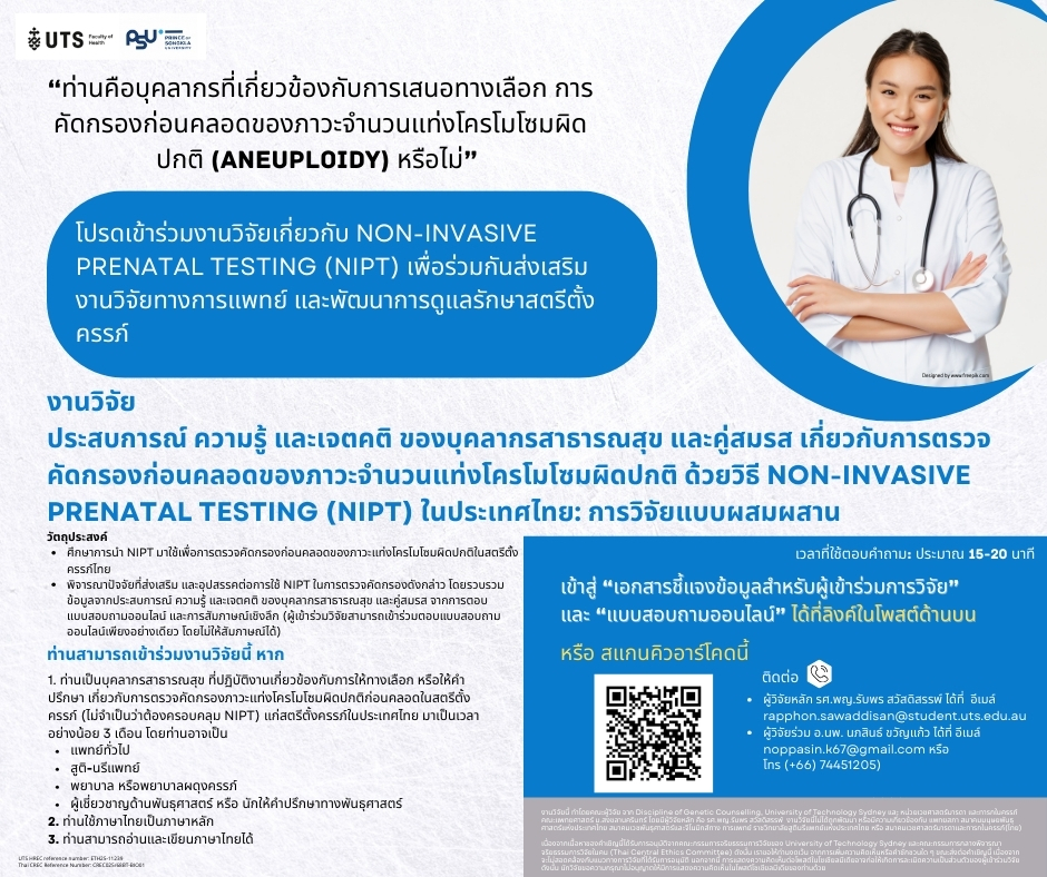 ขอเชิญบุคลากรทางการแพทย์ที่เกี่ยวข้อง และ สตรี หรือคู่ที่สมรส ที่เคยได้รับทางเลือกการตรวจคัดกรองภาวะจำนวนแท่งโครโมโซมผิดปกติก่อนคลอด ด้วยวิธี Non-invasive prenatal testing (NIPT) โปรดเข้าร่วมงานวิจัยเกี่ยวกับ Non-invasive prenatal testing (NIPT) เพื่อร่วมกันส่งเสริมงานวิจัยทางการแพทย์ และพัฒนาการดูแลรักษาสตรีตั้งครรภ์ -